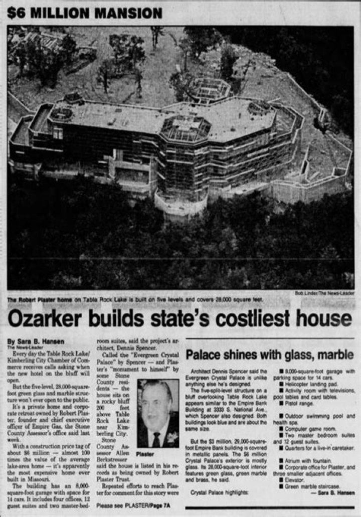 One of the most prestigious lakefront developments in the Midwest is the enormous estate known to some as the Evergreen Crystal Palace and to others simply as the Evergreen Lake Estate. The nearly 25,000 square foot glass and marble estate is magnificently situated 200 feet above Table Rock Lake, one of the most pristine and deepest lakes in the United States, on a rocky bluff covered in trees.