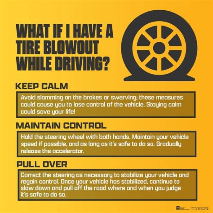 If your tires suddenly blow out, do the following: Do not slam on the brakes. Take your foot off the accelerator and gently apply the brakes. Steer straight ahead to a stop.Click to see full answer. Also, what should you do if you have a tire blowout quizlet?Take foot off gas, don’t use brakes, concentrate on steering, slow down gradually, brake softly when car is under control, pull completely off pavement/roadway.Similarly, when driving on the highway you have a tire blowout after you have slowed down and regained control you should? If you have a tire blowout or lose a wheel while driving, follow these steps: Hold the steering wheel tightly and steer straight ahead. Slow down gradually, taking your foot off the gas pedal slowly but without applying the brakes. Slow to a stop off the road, applying the brakes only when the car is almost stopped. Subsequently, one may also ask, what causes a tire to blowout? The hot weather combined with longer trips, faster speeds, and heavy loads can add too much stress to an already worn out tire and cause it to pop. Unlike a flat tire, blowouts happen when a tire explodes and may leave accident-causing rubber debris in its wake.What will happen if you have a front TYRE blowout?Tyre blowouts can be dangerous, especially if you are driving fast, because they can cause your vehicle to lose control. A front-tyre blowout will usually cause the vehicle to ‘pull’ towards the side with the blowout. A rear-tyre blowout will usually cause the vehicle to sway from side to side.